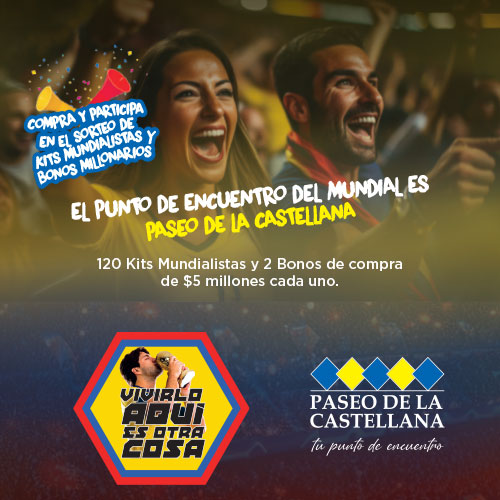 Del 15 de abril al 24 de julio de 2026, por cada $50.000 en compras participa por 120 Kits Mundialistas y 2 bonos de $5 millones. Registra tus facturas, acumula cupones y vive la emoción de ganar mientras disfrutas de tus compras en Paseo de la Castellana. ¡Entre más compres, más oportunidades tienes!